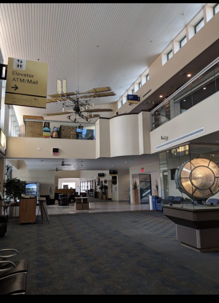 The best way I can describe this is: look for the landing light in a display case pre-security, then look up for the sign. Based on some other photos of the area, this is not a large and/or deep airport.